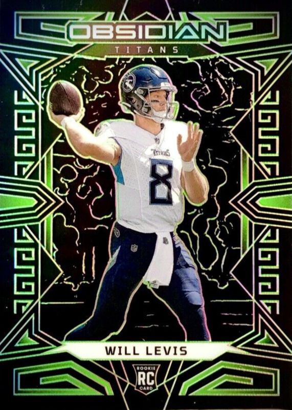 The Will Levis 2023 Obsidian #196 Electric Etch Green /25 Rookie card in Raw condition has not changed in price in the last 30 days and was last sold for $107.85 .
