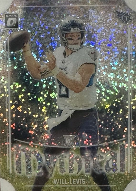 The Will Levis 2023 Optic #15 Mythical - White Sparkle /1 Rookie card in Raw condition has not changed in price in the last 30 days and was last sold for $282.77 .