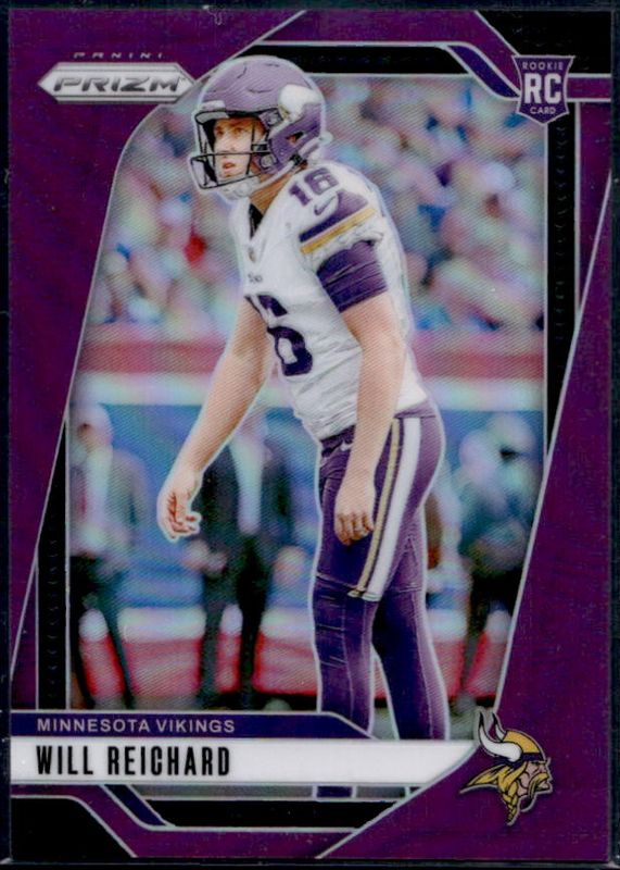 The Will Reichard 2024 Prizm #396 Purple /125 card is 1 of 83 Will Reichard's card variations in the 2024 Prizm set being tracked by Sports Card Investor, including Base, Choice Blue Yellow Green, Choice Silver, Disco, and Green.
