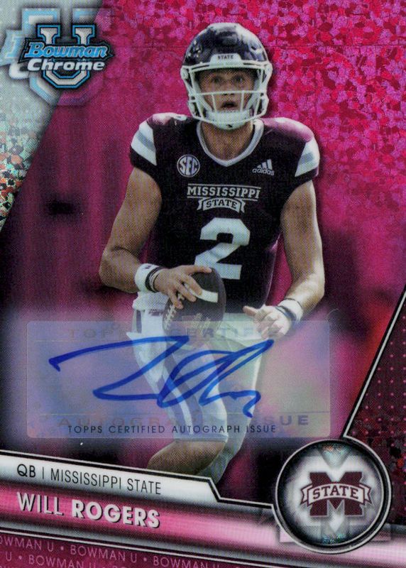 This card is 1 of 19 Will Rogers' card variations in the 2023 Bowman Chrome University set being tracked by Sports Card Investor, including Prospect Auto, Prospect Auto - Refractor /499, 1955 Bowman Football Autographs /99, Prospect Auto - Green Refractor /99, and Prospect Auto - Yellow Refractor /75.