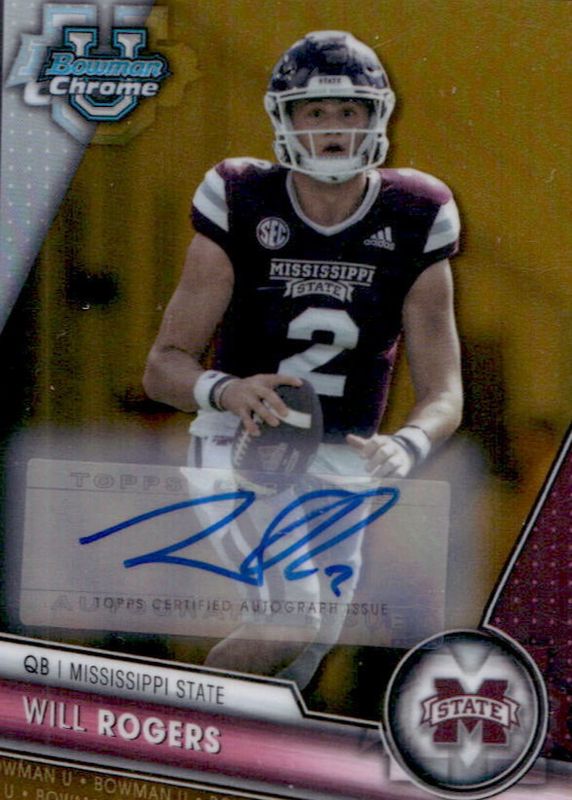 This card is 1 of 19 Will Rogers' card variations in the 2023 Bowman Chrome University set being tracked by Sports Card Investor, including Prospect Auto, Prospect Auto - Refractor /499, Prospect Auto - Fuchsia Mini-Diamond Refractor /150, 1955 Bowman Football Autographs /99, and Prospect Auto - Green Refractor /99.