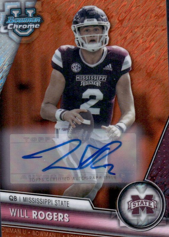 This card is 1 of 19 Will Rogers' card variations in the 2023 Bowman Chrome University set being tracked by Sports Card Investor, including Prospect Auto, Prospect Auto - Refractor /499, Prospect Auto - Fuchsia Mini-Diamond Refractor /150, 1955 Bowman Football Autographs /99, and Prospect Auto - Green Refractor /99.