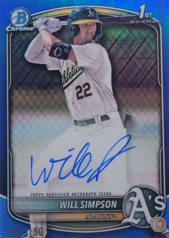 Best Prices Available For Sale of Will Simpson 2025 Bowman #CPA-WSI Chrome Prospect Auto - Blue Refractor /150 (1st)