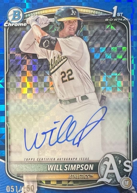 2025 Bowman Chrome WILL SIMPSON 1st Bowman Auto Blue X-Fractor /150 Athletics