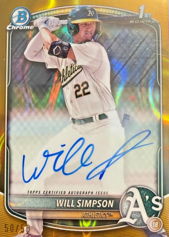 The Will Simpson 2025 Bowman #CPA-WSI Chrome Prospect Auto - Gold Lava Refractor /50 (1st) card in Raw condition has not changed in price in the last 30 days and was last sold for $31.00 .