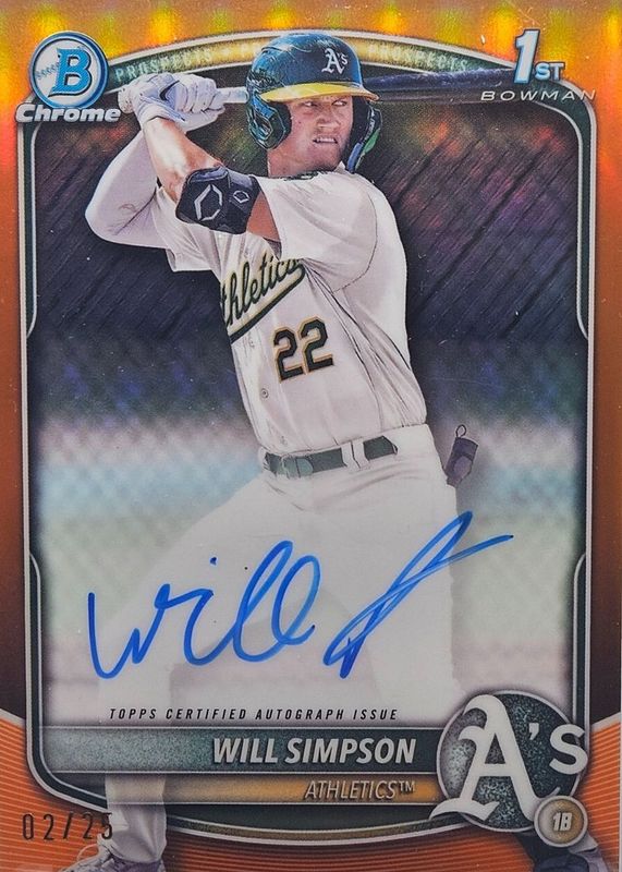 Best Prices Available For Sale of Will Simpson 2025 Bowman #CPA-WSI Chrome Prospect Auto - Orange Refractor /25 (1st)