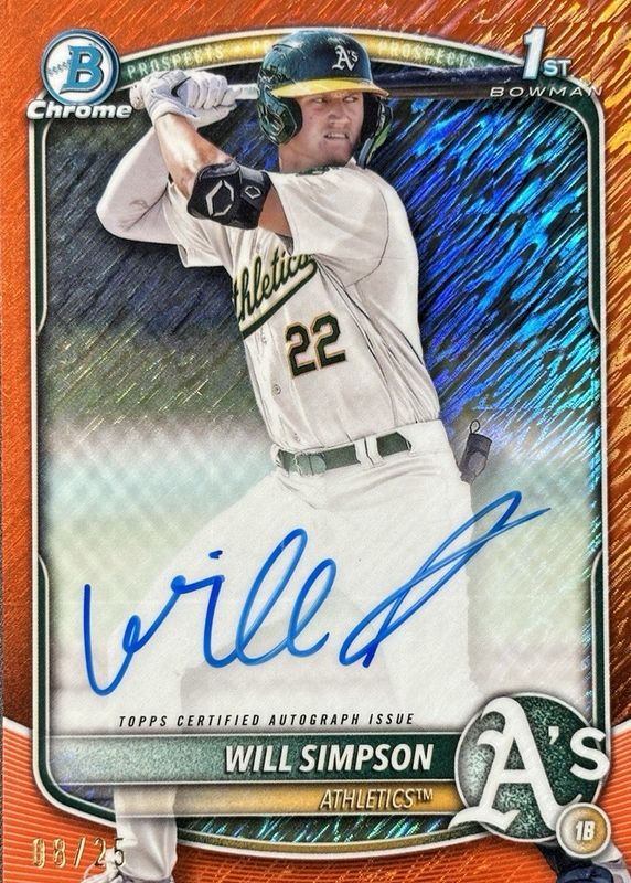 2025 Bowman Chrome Will Simpson 1st Orange Shimmer Auto /25 A’s