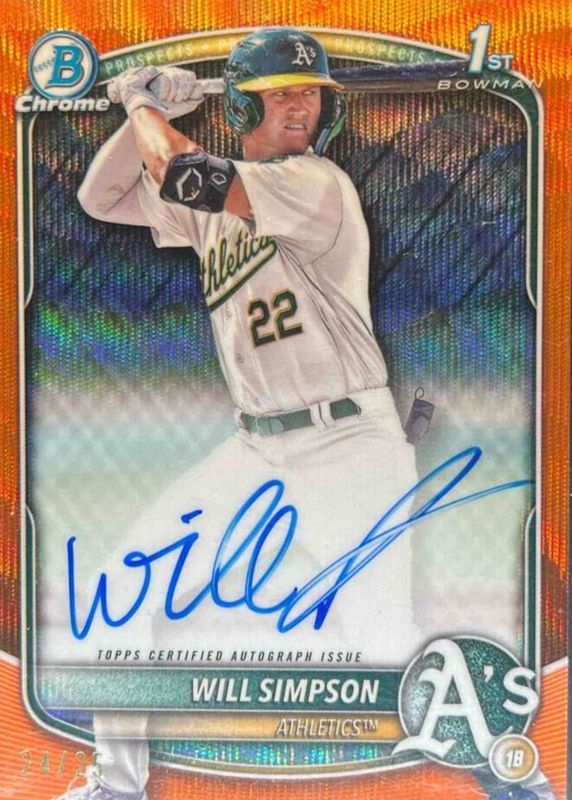 Best Prices Available For Sale of Will Simpson 2025 Bowman #CPA-WSI Chrome Prospect Auto - Orange Wave Refractor /25 (1st)