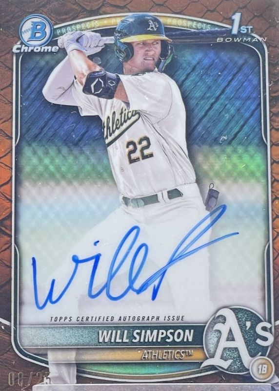 Best Prices Available For Sale of Will Simpson 2025 Bowman #CPA-WSI Chrome Prospect Auto - Reptilian Orange Refractor /25 (1st)