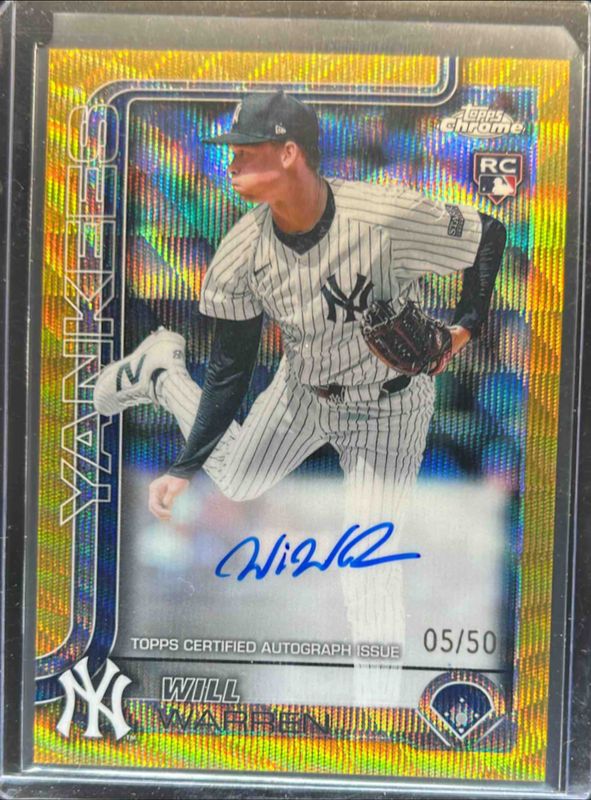 The Will Warren 2025 Topps Chrome #RA-WWA Rookie Autographs - Gold Wave Refractor /50 card is 1 of 72 Will Warren's card variations in the 2025 Topps Chrome set being tracked by Sports Card Investor, including Base, Geometric Refractor, Lightboard Logo Variation, Negative Refractor, and Prism Refractor.