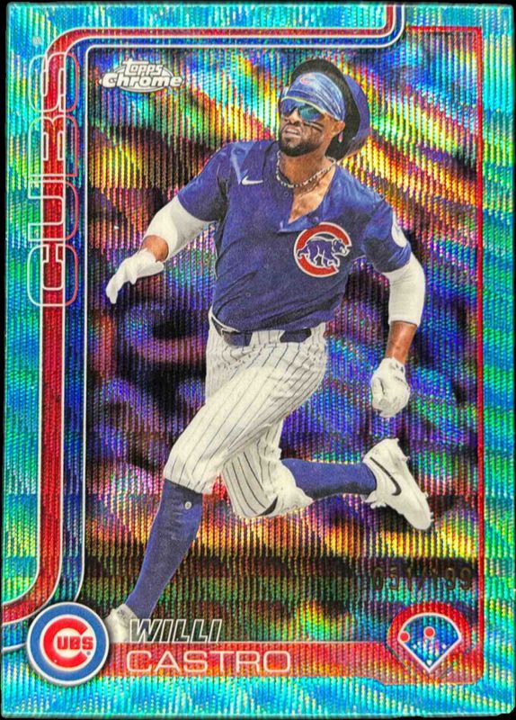 The Willi Castro 2025 Topps Chrome Update #USC67 Aqua Wave Refractor /199 card is 1 of 52 Willi Castro's card variations in the 2025 Topps Chrome Update set being tracked by Sports Card Investor, including Base, Geometric Refractor, Negative Refractor, Prism Refractor, and RayWave Refractor.