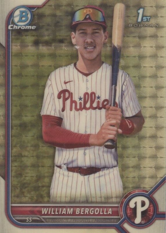 This card is 1 of 47 William Bergolla's card variations in the 2022 Bowman Chrome set being tracked by Sports Card Investor, including Prospects (1st), Prospects - Black & White Mini-Diamond Refractor (1st), Prospects - Shimmer Refractor (1st), Prospects - Refractor /499 (1st), and Prospects - Speckle Refractor /299 (1st).