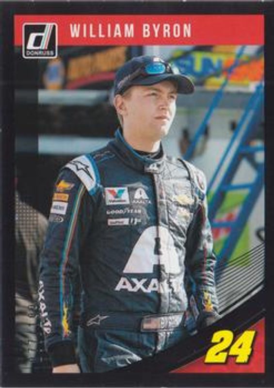 The William Byron 2019 Donruss NASCAR #82 Black /199 card is 1 of 55 William Byron's card variations in the 2019 Donruss NASCAR set being tracked by Sports Card Investor, including #128a Base, #128b Base, #128a Silver, #128a Gold /299, and #128b Gold /299.
