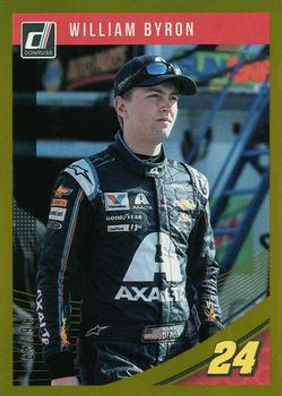 The William Byron 2019 Donruss NASCAR #82 Gold Press Proof /99 card is 1 of 55 William Byron's card variations in the 2019 Donruss NASCAR set being tracked by Sports Card Investor, including #128a Base, #128b Base, #128a Silver, #128a Gold /299, and #128b Gold /299.