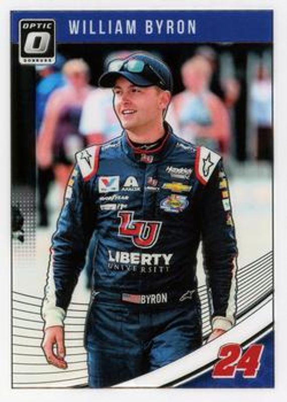 The William Byron 2019 Donruss NASCAR #33 Optic card is 1 of 55 William Byron's card variations in the 2019 Donruss NASCAR set being tracked by Sports Card Investor, including #128a Base, #128b Base, #128a Silver, #128a Gold /299, and #128b Gold /299.
