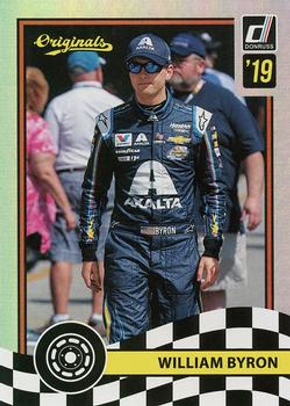 The William Byron 2019 Donruss NASCAR #O14 Originals Holographic card is 1 of 55 William Byron's card variations in the 2019 Donruss NASCAR set being tracked by Sports Card Investor, including #128a Base, #128b Base, #128a Silver, #128a Gold /299, and #128b Gold /299.