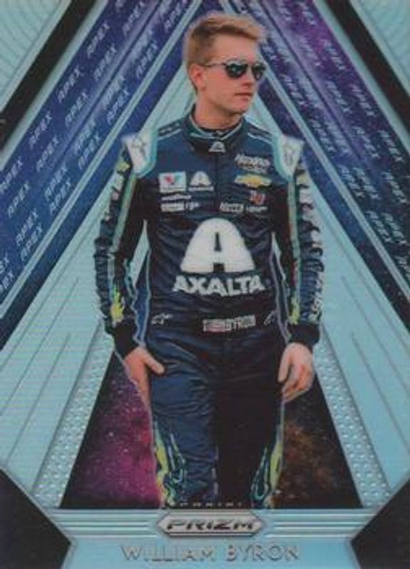The William Byron 2019 Prizm NASCAR #A-8 Apex card is 1 of 68 William Byron's card variations in the 2019 Prizm NASCAR set being tracked by Sports Card Investor, including #59 Base, #66 Base, #20 Base, #66 Camo, and #59 Camo.