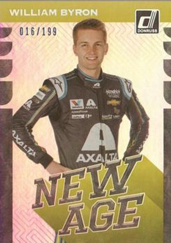 The William Byron 2020 Donruss NASCAR #NA1 New Age Holographic /199 card is 1 of 124 William Byron's card variations in the 2020 Donruss NASCAR set being tracked by Sports Card Investor, including #100 Base, #55 Base, #163 Base, #197 Base, and #55 Carolina Blue.