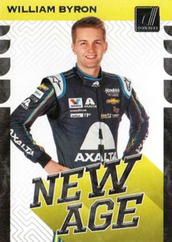 The William Byron 2020 Donruss NASCAR #NA1 New Age card is 1 of 124 William Byron's card variations in the 2020 Donruss NASCAR set being tracked by Sports Card Investor, including #100 Base, #55 Base, #163 Base, #197 Base, and #55 Carolina Blue.