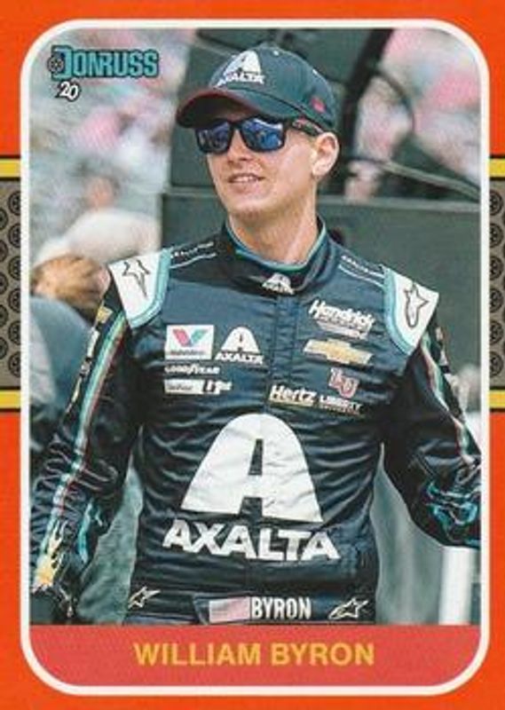 The William Byron 2020 Donruss NASCAR #163 Orange card is 1 of 124 William Byron's card variations in the 2020 Donruss NASCAR set being tracked by Sports Card Investor, including #100 Base, #55 Base, #163 Base, #197 Base, and #55 Carolina Blue.