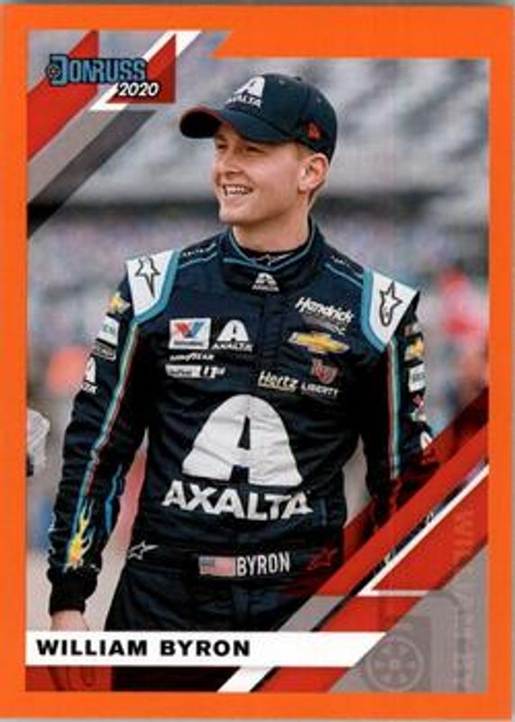 The William Byron 2020 Donruss NASCAR #55 Orange card is 1 of 124 William Byron's card variations in the 2020 Donruss NASCAR set being tracked by Sports Card Investor, including #100 Base, #55 Base, #163 Base, #197 Base, and #55 Carolina Blue.