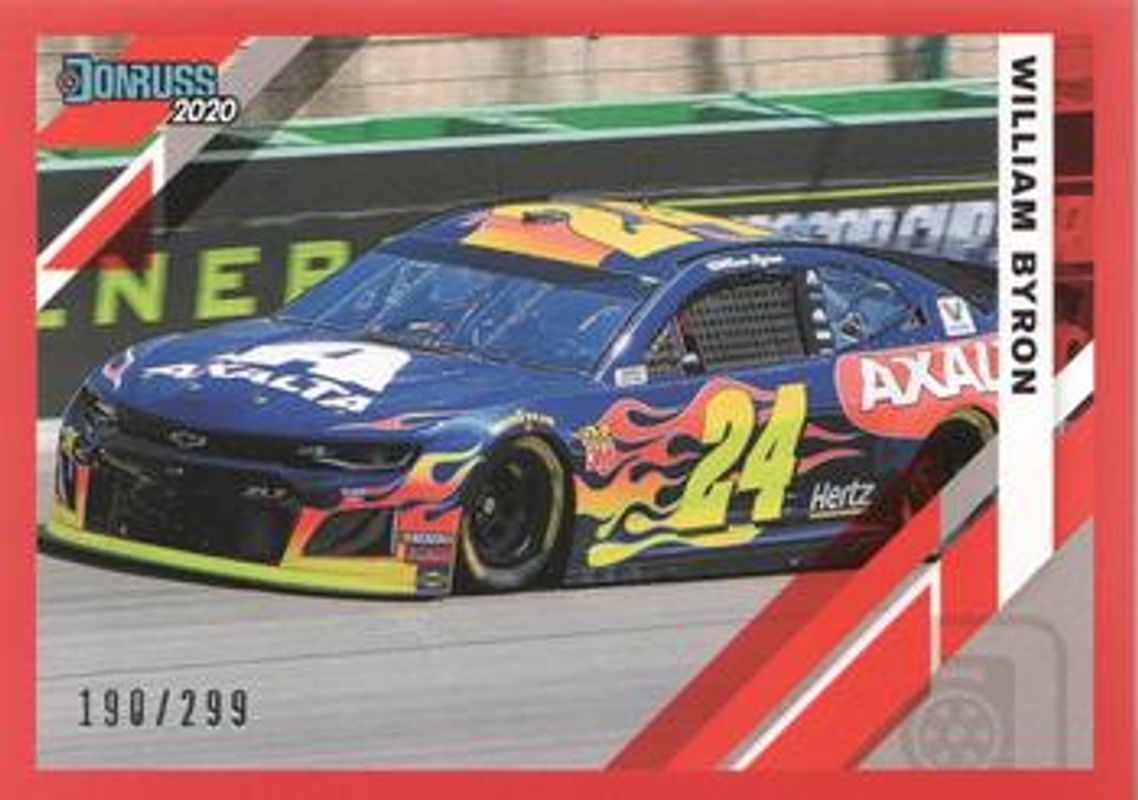 The William Byron 2020 Donruss NASCAR #100 Red /299 card is 1 of 124 William Byron's card variations in the 2020 Donruss NASCAR set being tracked by Sports Card Investor, including #100 Base, #55 Base, #163 Base, #197 Base, and #55 Carolina Blue.