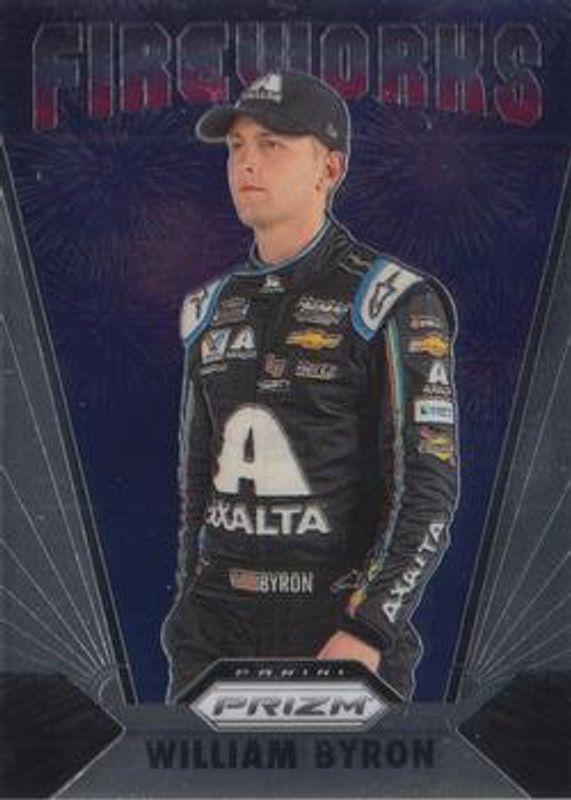 The William Byron 2020 Prizm NASCAR #F14 Fireworks card is 1 of 57 William Byron's card variations in the 2020 Prizm NASCAR set being tracked by Sports Card Investor, including Base, Blue, Blue & Carolina Blue Hyper, Green & Yellow Hyper, and Red.