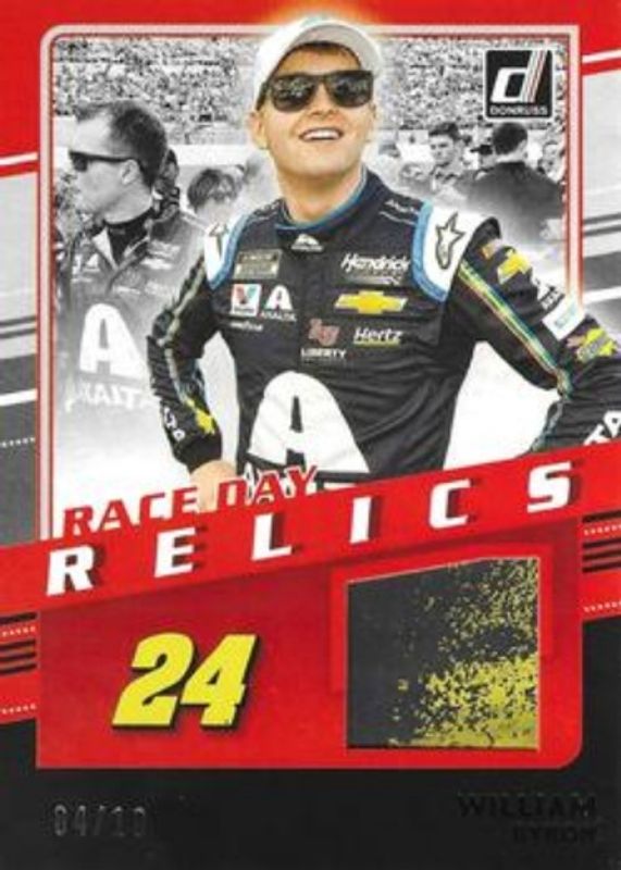 The William Byron 2021 Donruss NASCAR #RDR-WB Race Day Relics - Black /10 card is 1 of 107 William Byron's card variations in the 2021 Donruss NASCAR set being tracked by Sports Card Investor, including #24 Base, #79 Base, #43 Base, #162 Base, and #43 Carolina Blue.