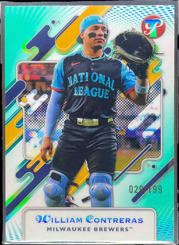 The William Contreras 2025 Topps Pristine #287 Aqua Refractor /199 card is 1 of 46 William Contreras' card variations in the 2025 Topps Pristine set being tracked by Sports Card Investor, including #134 Base, #287 Base, #134 Pristine Refractor, #287 Pristine Refractor, and #134 Refractor.