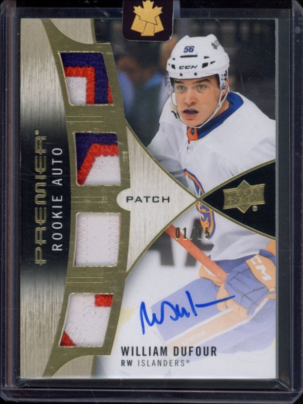 The William Dufour 2023 Upper Deck Premier #PRA-DU 2023 Premier Rookie Auto - Patch /15 card is 1 of 29 William Dufour's card variations in the 2023 Upper Deck Premier set being tracked by Sports Card Investor, including Base /399, Bronze /199, Gold /65, Ruby /49, and Rose Gold /25.
