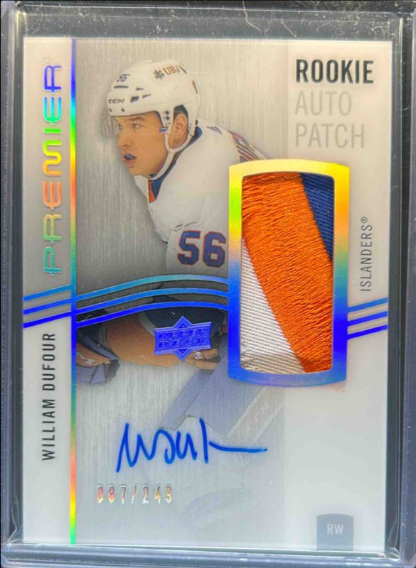 The William Dufour 2023 Upper Deck Premier #AR-WD Acetate Rookie Auto Patch /99 card is 1 of 29 William Dufour's card variations in the 2023 Upper Deck Premier set being tracked by Sports Card Investor, including Base /399, Bronze /199, Gold /65, Ruby /49, and Rose Gold /25.