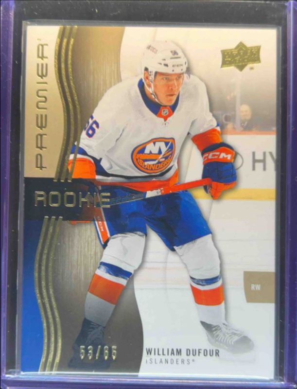 The William Dufour 2023 Upper Deck Premier #105 Gold /65 Rookie card is 1 of 29 William Dufour's card variations in the 2023 Upper Deck Premier set being tracked by Sports Card Investor, including Base /399, Bronze /199, Ruby /49, Rose Gold /25, and Fight Strap /15.