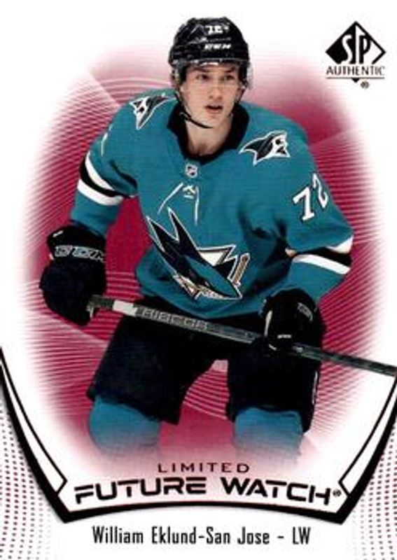 The William Eklund 2021 SP Authentic #177 Limited Red Rookie card is 1 of 23 William Eklund's card variations in the 2021 SP Authentic set being tracked by Sports Card Investor, including Black Autographs, Limited Gold /99, Future Watch Inscribed /50, Limited Black /1, and Future Watch Acetate.