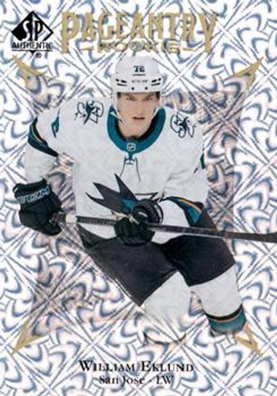 The William Eklund 2021 SP Authentic #P-72 Pageantry Rookie card is 1 of 23 William Eklund's card variations in the 2021 SP Authentic set being tracked by Sports Card Investor, including Black Autographs, Limited Red, Limited Gold /99, Future Watch Inscribed /50, and Limited Black /1.
