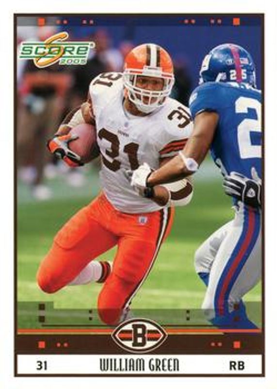 The William Green 2005 Score #71 Glossy card is 1 of 6 William Green's card variations in the 2005 Score set being tracked by Sports Card Investor, including Base, Scorecard /599, Adrenaline /399, Revolution /199, and Final Score /17.