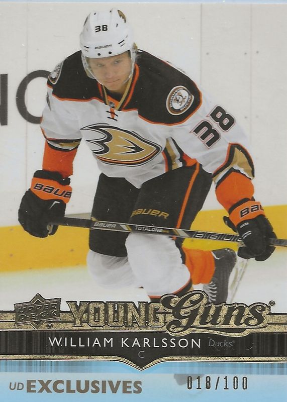 The William Karlsson 2014 Upper Deck #201 Young Guns - UD Exclusives /100 Rookie card in Raw condition has not changed in price in the last 30 days and was last sold for $71.00 .