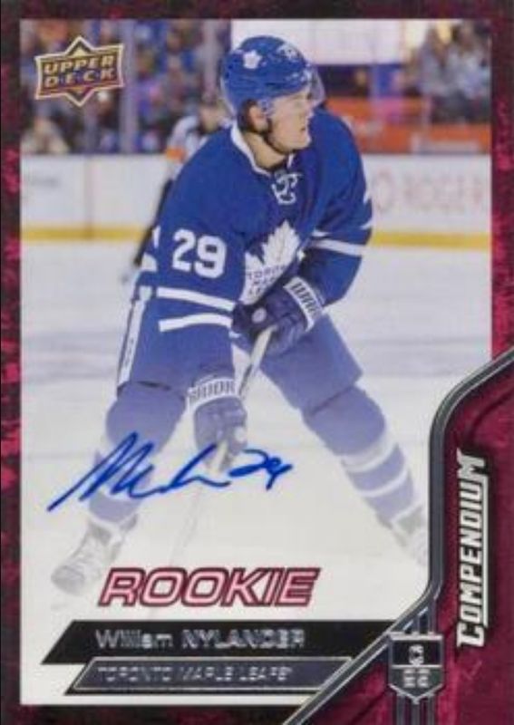 The William Nylander 2016 Upper Deck Compendium #SP-WN Magenta Rookie Autographs Achievement card is 1 of 8 William Nylander's card variations in the 2016 Upper Deck Compendium set being tracked by Sports Card Investor, including Blue, Gold, Red, Printing Plates Black /1, and Printing Plates Cyan /1.