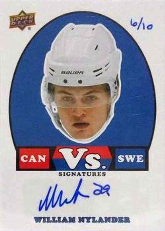 The William Nylander 2017 Upper Deck Team Canada #VS-8 Vs. Signatures /10 card is 1 of 3 William Nylander's card variations in the 2017 Upper Deck Team Canada set being tracked by Sports Card Investor, including Vs. Black, and Vs. (Versus).