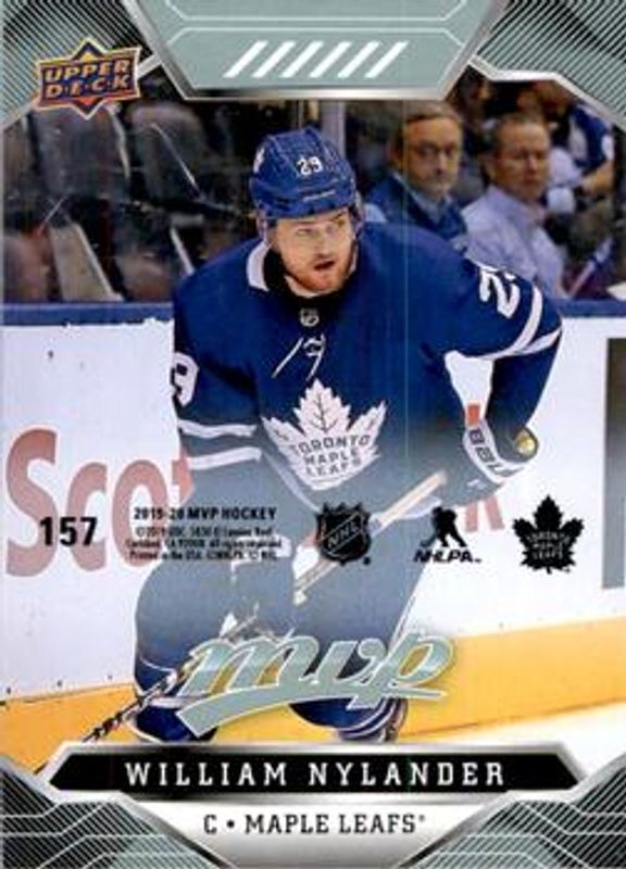 The William Nylander 2019 Upper Deck MVP #157 Puzzle Backs card is 1 of 13 William Nylander's card variations in the 2019 Upper Deck MVP set being tracked by Sports Card Investor, including Base, Blue, Gold Script, Silver Script, and Super Script /25.
