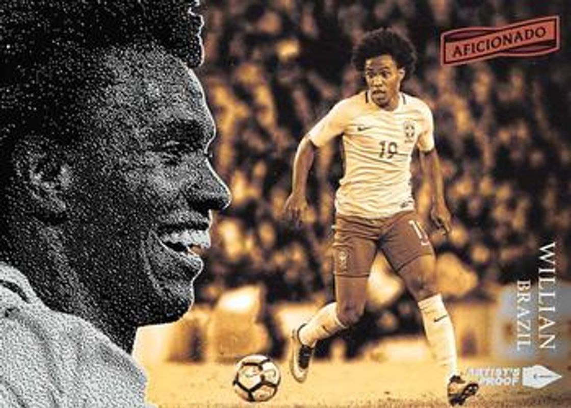 The Willian 2016 Aficionado #31 Artist's Proof card is 1 of 6 Willian's card variations in the 2016 Aficionado set being tracked by Sports Card Investor, including Base, First Kick, Artist's Proof Red /99, Artist's Proof Bronze /49, and Artist's Proof Gold /1.