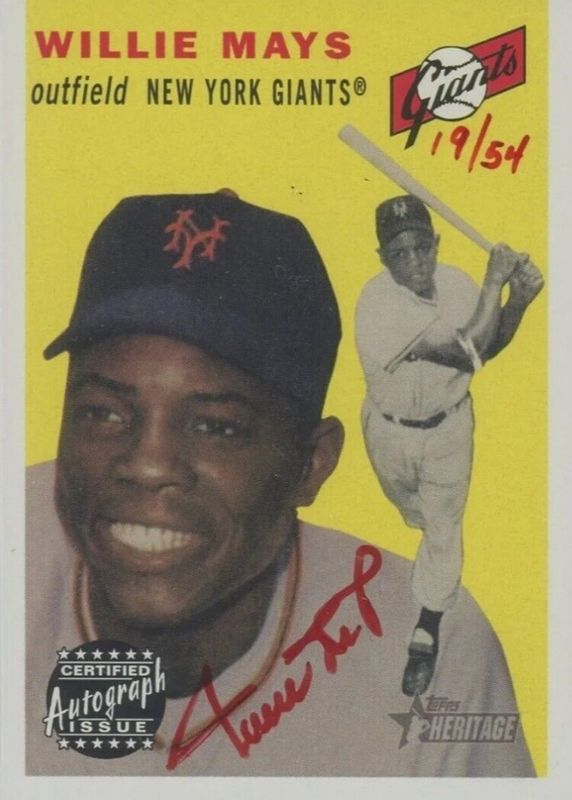 The Willie Mays 2003 Topps Heritage #RO-WM Real One Autographs - Red Ink /54 card in Raw condition has not changed in price in the last 30 days and was last sold for $1,499.99 .