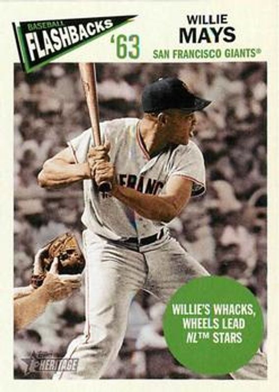 The Willie Mays 2012 Topps Heritage #BF-WM Baseball Flashbacks card is 1 of 5 Willie Mays' card variations in the 2012 Topps Heritage set being tracked by Sports Card Investor, including 63 Mint, Flashback Stadium Relics, Real One Autographs, and Real One Autographs - Red Ink /63.