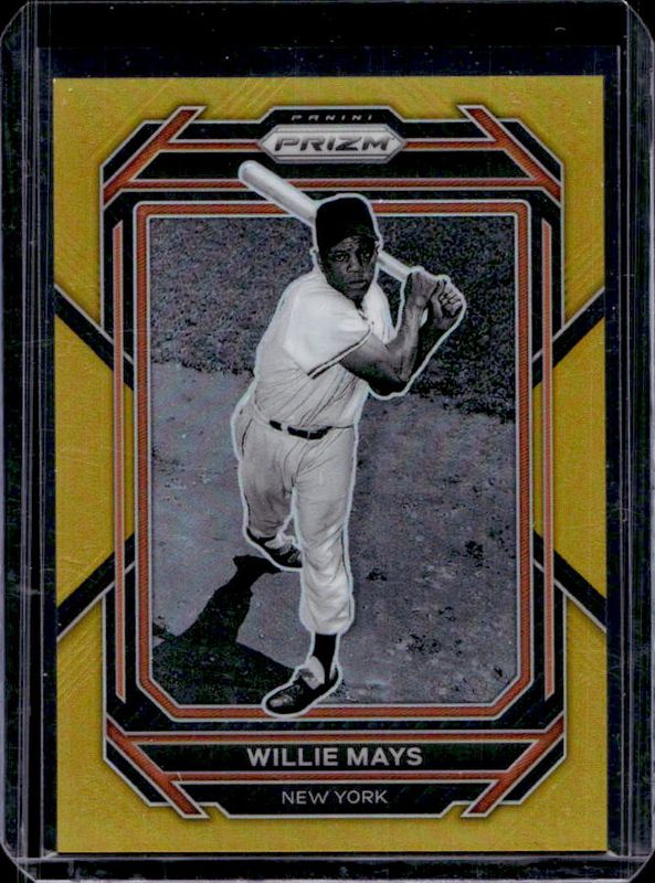 The Willie Mays 2023 Prizm #273 Gold /10 card is 1 of 69 Willie Mays' card variations in the 2023 Prizm set being tracked by Sports Card Investor, including #211 Base, #273 Base, #273 Blue Ice, #273 Giraffe, and #211 Giraffe.