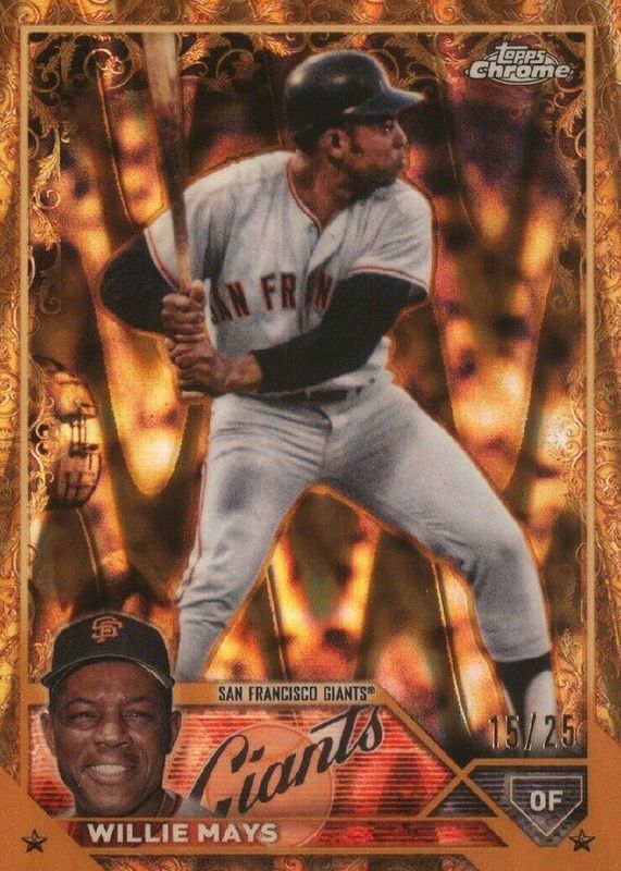 The Willie Mays 2023 Topps Gilded Collection #22 RayWave Gold Etch Refractor /25 card in Raw condition has not changed in price in the last 30 days and was last sold for $36.02 .