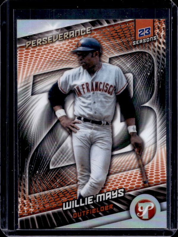 The Willie Mays 2025 Topps Pristine #P-6 Perseverance card is 1 of 28 Willie Mays' card variations in the 2025 Topps Pristine set being tracked by Sports Card Investor, including Base, Pristine Refractor, Refractor, Aqua Refractor /199, and Pristine Aqua Refractor /199.