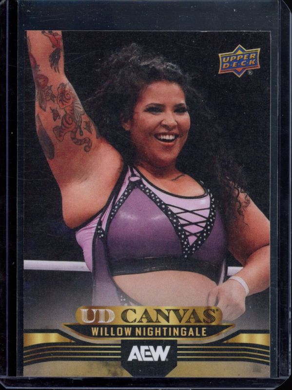 The Willow Nightingale 2025 Upper Deck AEW #C-13 UD Canvas card is 1 of 41 Willow Nightingale's card variations in the 2025 Upper Deck AEW set being tracked by Sports Card Investor, including Base, Clear Cut, Diamond Plate, Gold, and Outburst.