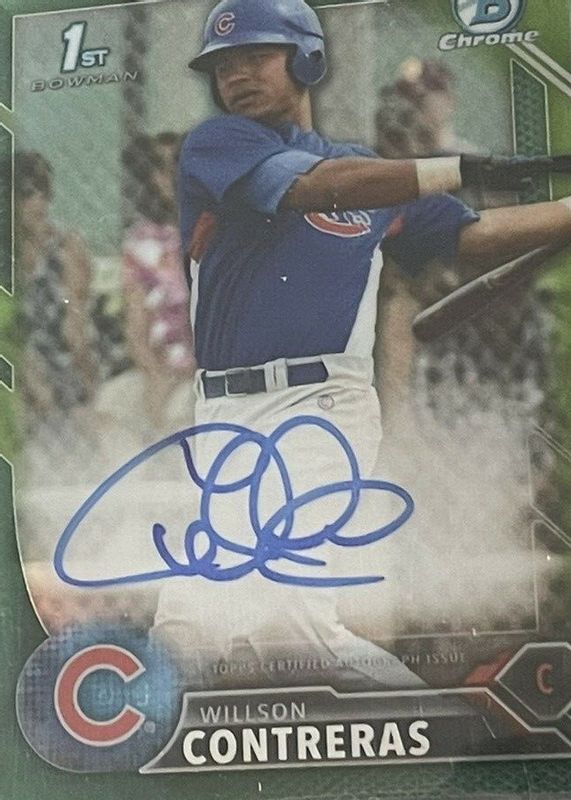 The Willson Contreras 2016 Bowman #CPA-WC Chrome Prospect Auto - Green Refractor /99 (1st) Rookie card in Raw condition has not changed in price in the last 30 days and was last sold for $96.00 .