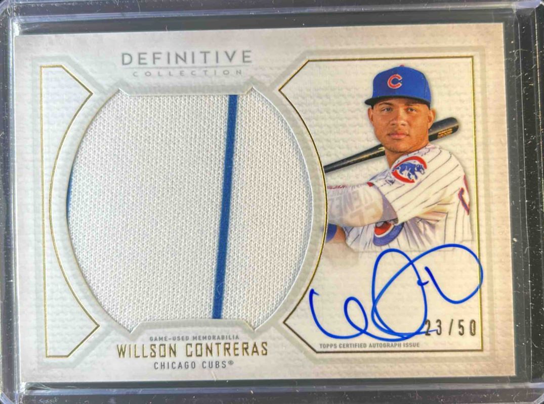 The Willson Contreras 2019 Topps Definitive Collection #ARC-WC Base /50 card is 1 of 24 Willson Contreras' card variations in the 2019 Topps Definitive Collection set being tracked by Sports Card Investor, including Green /25, Purple /10, Red Jersey Button /1, Red Laundry Tag /1, and Red Majestic Logo /1.