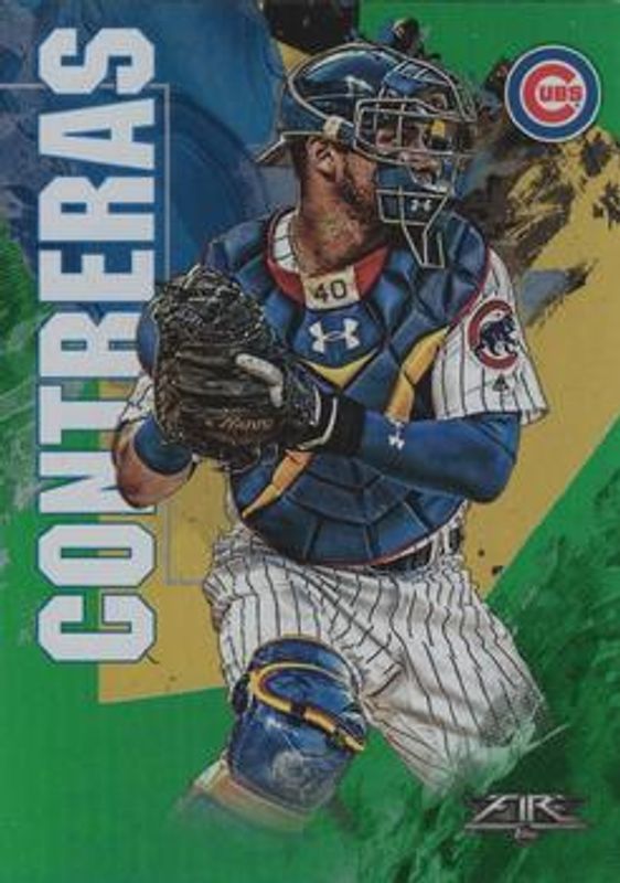 The Willson Contreras 2019 Topps Fire #10 Green /199 card is 1 of 15 Willson Contreras' card variations in the 2019 Topps Fire set being tracked by Sports Card Investor, including Base, Blue Chip, Flame, Gold Minted, and Onyx.