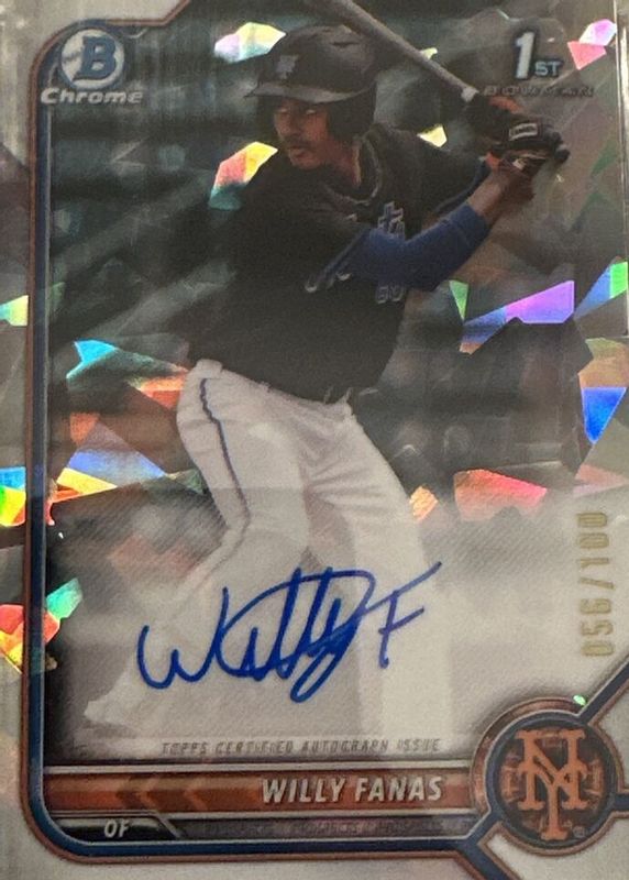 This card is 1 of 22 Willy Fanas' card variations in the 2022 Bowman Chrome set being tracked by Sports Card Investor, including Prospect Auto (1st), Prospect Auto - Black & White Mini-Diamond Refractor (1st), Prospect Auto - Refractor /499 (1st), Prospect Auto - Speckle Refractor /299 (1st), and Prospect Auto - Purple Refractor /250 (1st).
